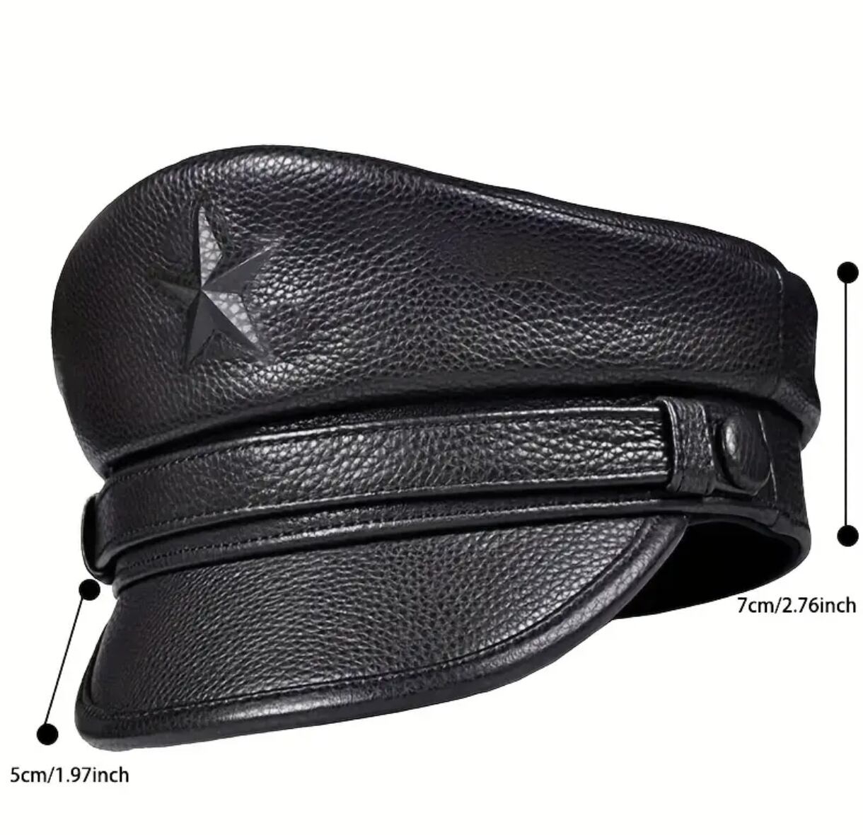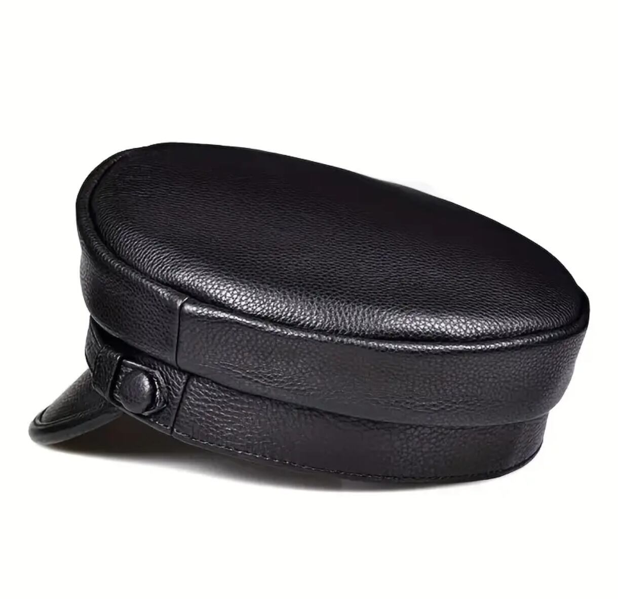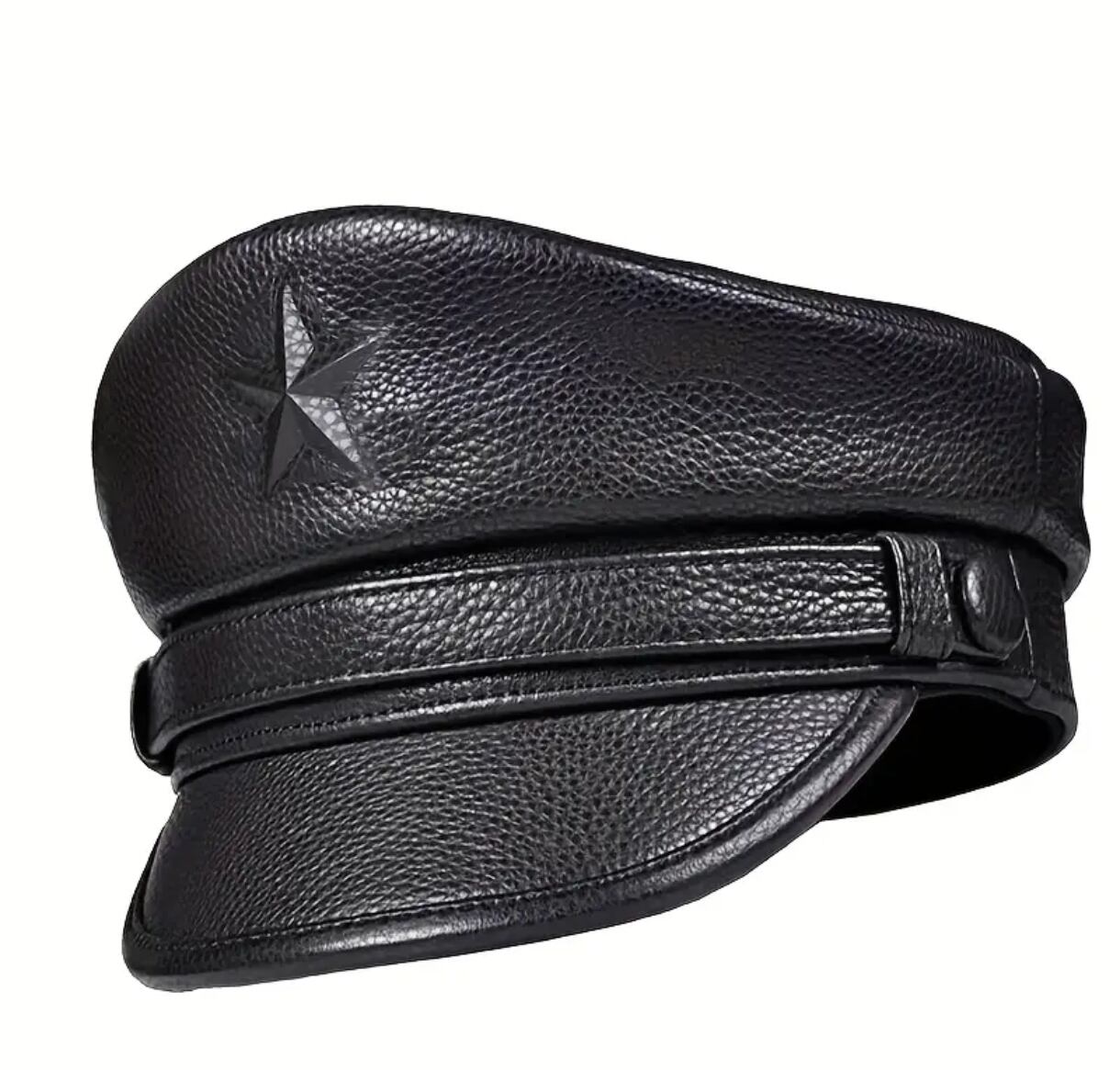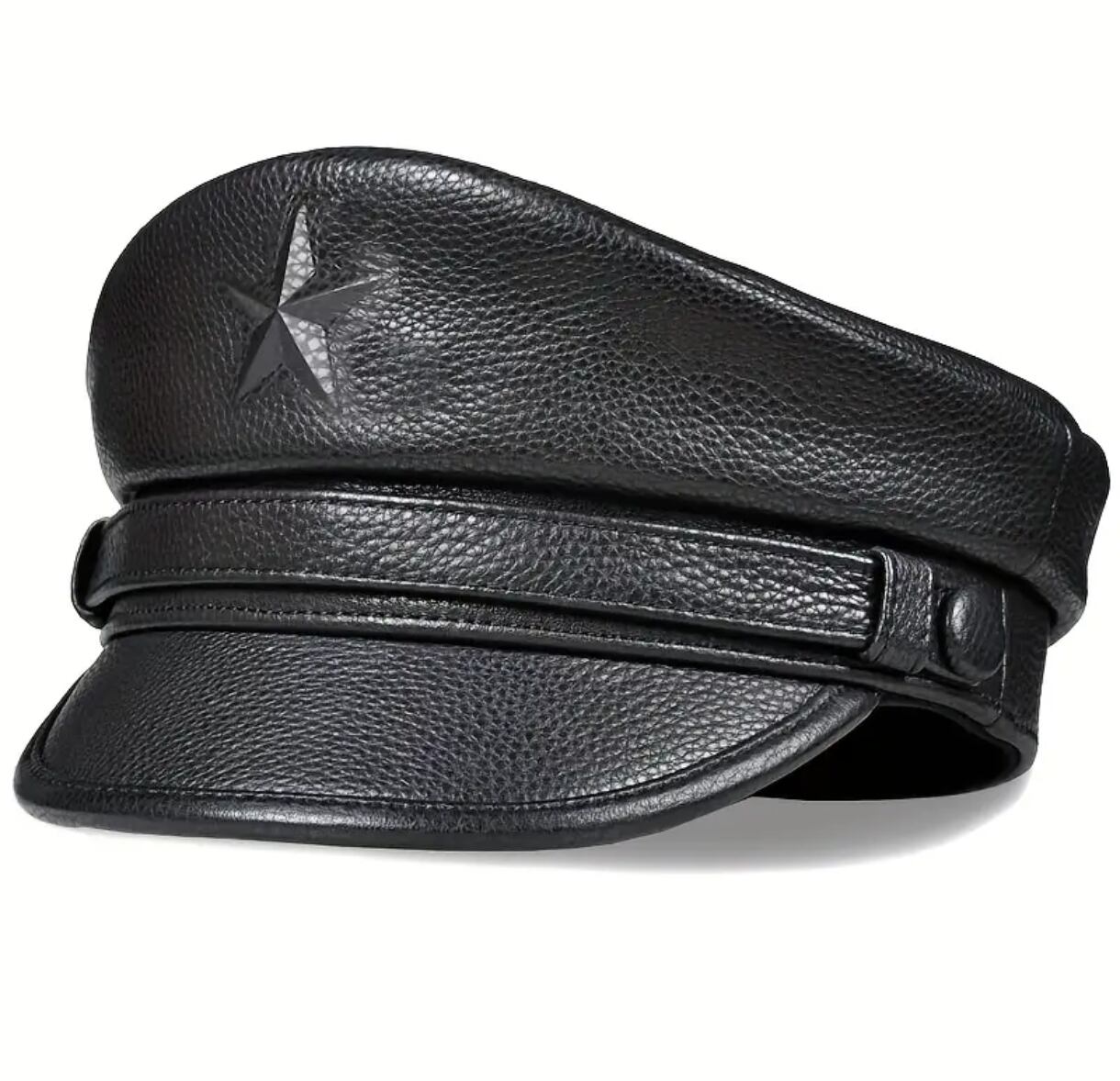 CK3224104ブラック メンズ本牛革キャップが新登場!スタイリッシュなブラックのフラットキャップは、スターエンボスデザインが際立つ一品です。カジュアルなシーンでもフォーマルなシーンでも活躍できるため、様々なコーディネートに対応します。特にモーターサイクル愛好家の方には最適なモーターサイクルハットです。