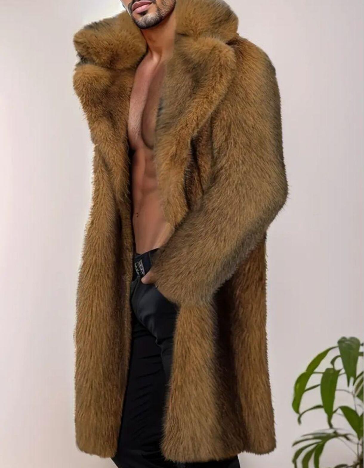 メンズフェイクファー ロングオーバーコートは、落ち着いたブラウンカラーがおしゃれな一着。寒い季節にぴったりの温かいフェイクファー素材が、オシャレ感をアップしてくれます。パフォーマンス、ナイトクラブ、パーティーなどの特別な場面にもぴったりなメンズカジュアルアイテムです。