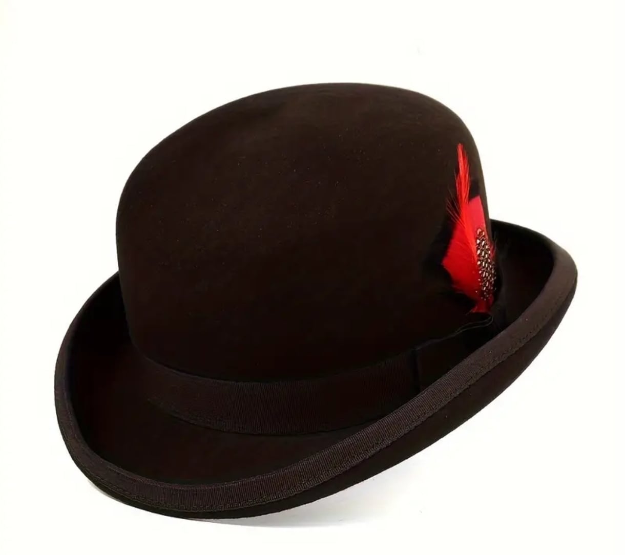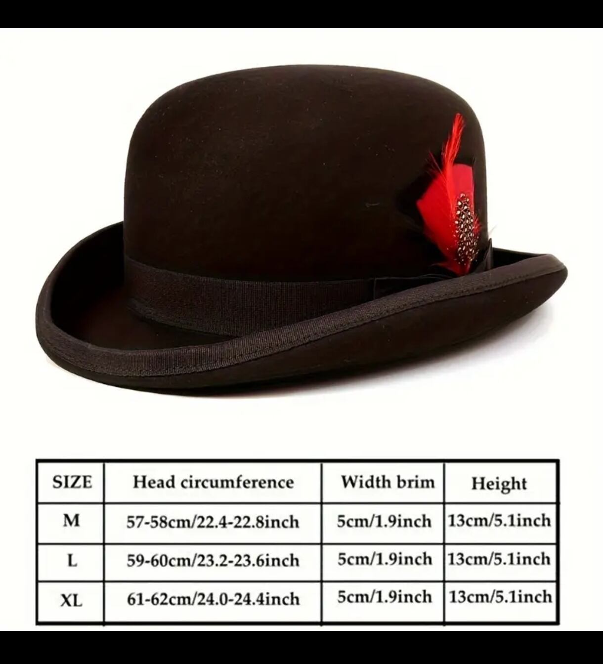 BQ78760 100%ウール 黒 ボウラーハット Lサイズ パフォーマンストップハット フェザーデコレーション付き